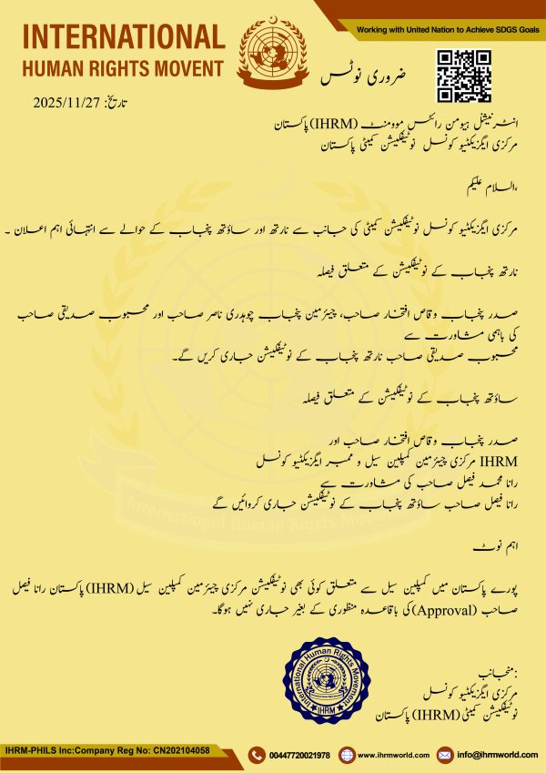 The main objectives of the International Human Rights Movement are the Service of Humanity without Cast, Color and Creed. The struggle against the violation of the Human Rights, bloodshed and terrorism. To provide its services for the noble cause of maintaining peace and disputes between the nations groups individuals and organizations. To set up seminars and conferences on international issues of Human Rights, peace, democracy, education, health, child labor, women rights, against terrorism and narcotics or drugs trafficking.